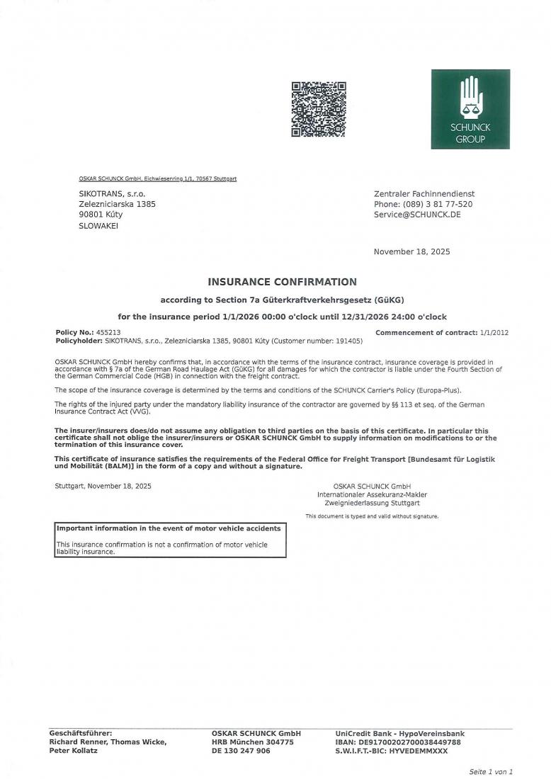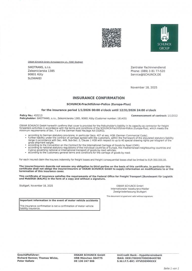 Koncesná listina, Živnostenský list, Povolenie na medzinárodnú prepravu, Osvedčenie o odbornej spôsobilosti, Ovedčenie o registrácii pre DPH a DIČ, CMR poistenie, ISO certifikát: Systém riadenia spoločnosti, Politika kvality, Certifikát solventnosti, GMP+ certifikát CZ a EN verzia.